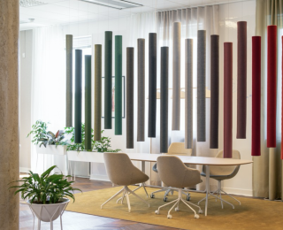 Panele akustyczne Cell (prod. Marbet Felt) wygłuszają pomieszczenie, obniżają poziom hałasu i redukują pogłos w biurach. Dzięki temu zwiększają komfort akustyczny użytkowników, którzy mogą rozmawiać ciszej, pozostając słyszalnymi, a równocześnie są chronieni przed hałasem, czy to szmerem niechcianych rozmów, czy dźwiękami urządzeń elektronicznych. Panele wykonane są z ekologicznej włókniny rPET budzącej skojarzenia z wełną. Tworzą przytulny nastrój, wprowadzają ciepłą, domową atmosferę do przestrzeni biurowych, służącą kreatywności i wydajności pracowników.